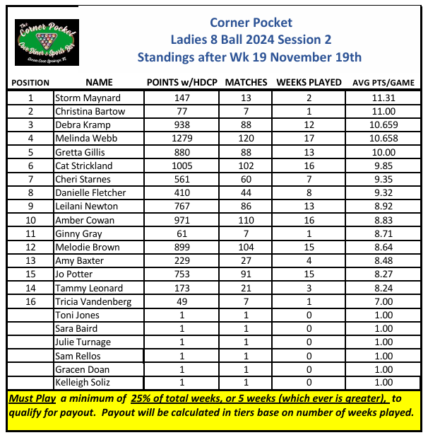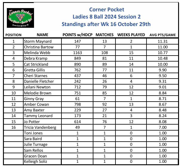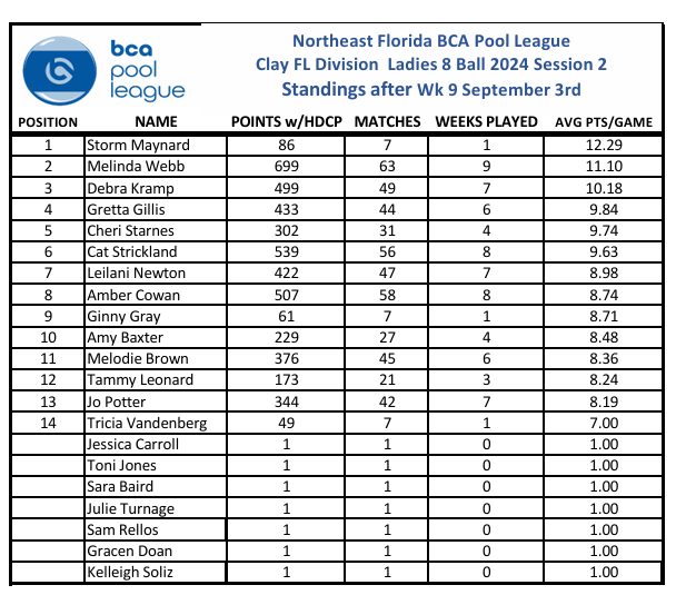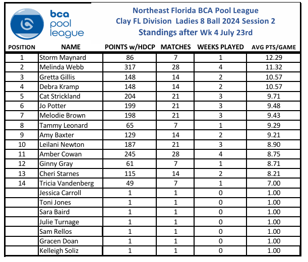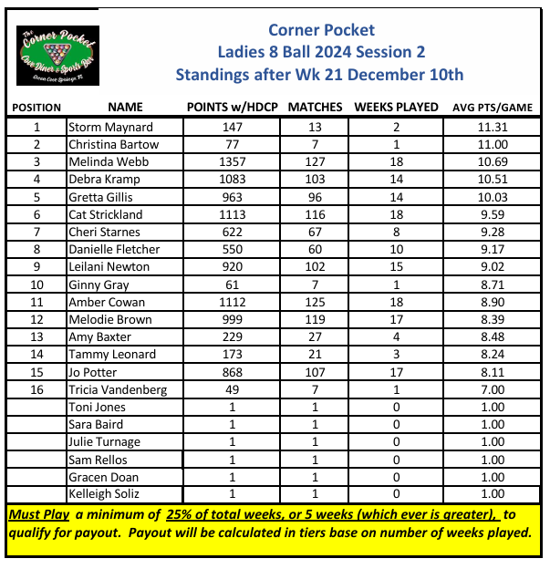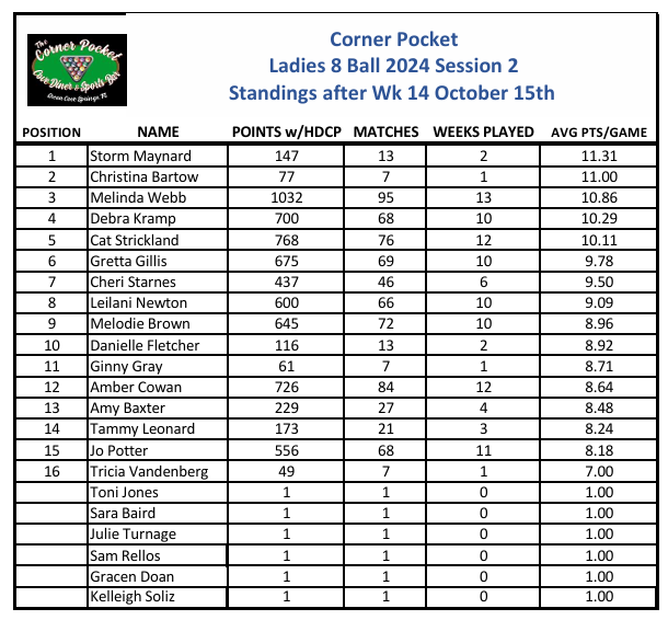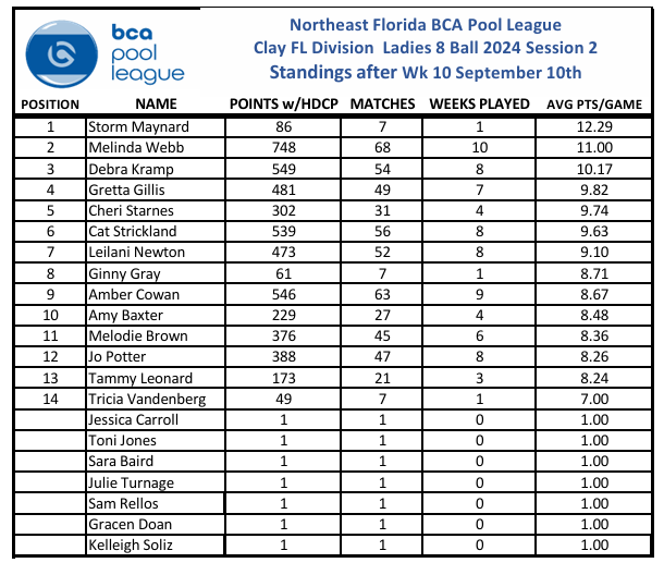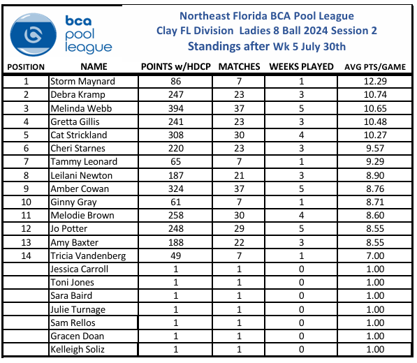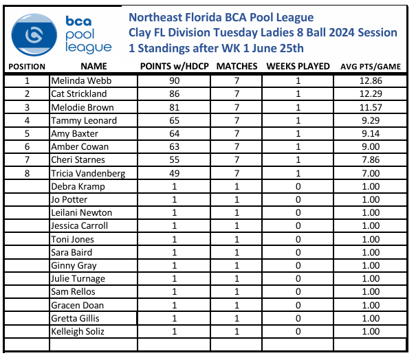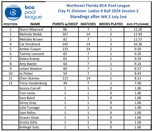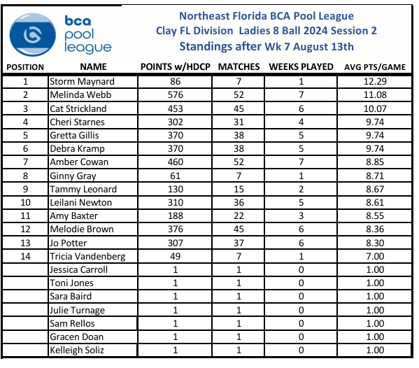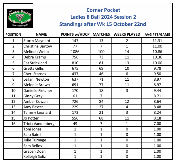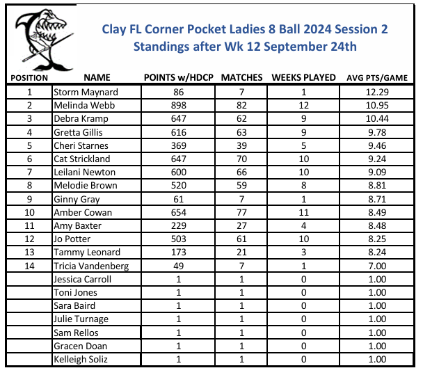 Clay Tuesday 8 Ball Standings 2024 Session 2