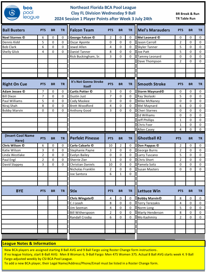Clay Wednesday 9 Ball Points History
